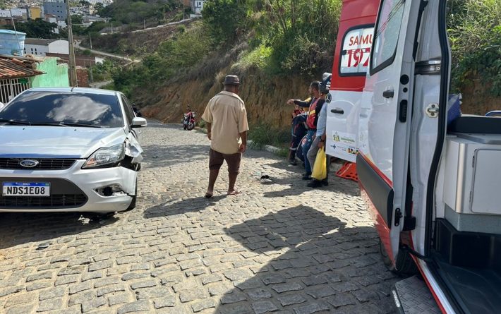 Motociclista fica ferido após acidente entre moto e carro em ladeira íngreme de bairro em Jaguaquara, às margens da BR-420
