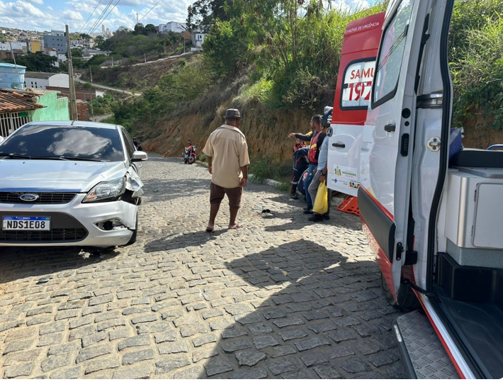 Motociclista fica ferido após acidente entre moto e carro em ladeira íngreme de bairro em Jaguaquara, às margens da BR-420